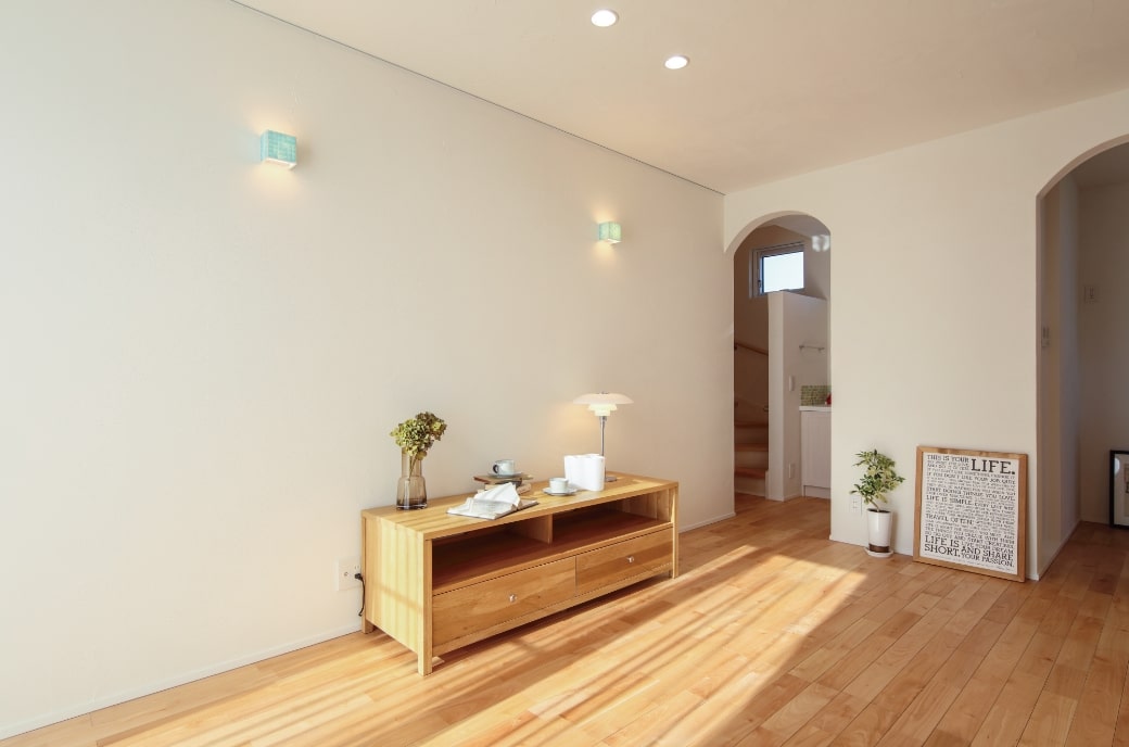 天井・壁・床などには自然素材を使用。シックハウス症候群やアレルギーの原因といわれるホルムアルデヒドが含まれていないため安心です。何よりやさしい感触や風合いが楽しめます。天井や壁には調湿作用があり補修も簡単な漆喰を、床には素足でも心地いい無垢の床材、防蟻剤は農薬由来の殺虫剤ではなく天然素材のホウ酸を使用。また、屋根・壁・基礎には、耐震・防水・透湿・断熱・気密性を考慮した高耐久部材を使用。そして、屋根・壁・雨樋は紫外線による変色・色あせ・割れなどに強い部材を厳選しています。窓のフレームは断熱・遮熱・気密性に優れた樹脂窓を使用。ガラスは、中空層があり断熱効果が高いLow-Eトリプルガラスです。外壁は熟練の左官職人の手仕事による塗り壁を採用しています。